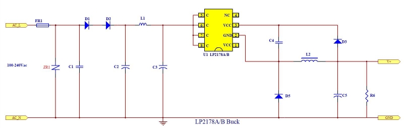 降壓轉(zhuǎn)換:LP2178B芯片為核心部件,通過電感L1和電容C4、C5等外圍元件實(shí)現(xiàn)降壓功能,將高電壓直流電轉(zhuǎn)換為穩(wěn)定的5V輸出。