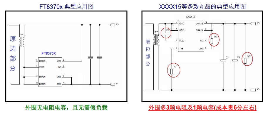 | FT8370A/B/C | SOP-8 | 通過Drain腳散熱 | 2A | 通用型,成本低 |